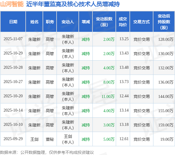 证券之星消息,根据11月10日市场公开信息、上市公司公告及交易所披露数据整理包卜nba录像im电竞官网,山河智能(002097)最新董监高及相关人员股份变动情况:2025年11月7日公司高管朱建新共减持公司股份2.0万股包卜nba录像im电竞官网im电竞官网,占公司总股本为0.0019%im电竞官网im电竞官网im电竞官网。变动期间公司股价下跌1.44%,11月7日当日收盘报13.0元